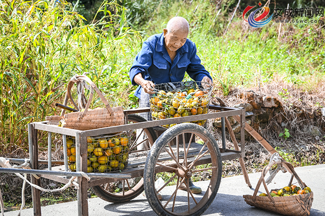 沿著公陽鄉(xiāng)紫華村的鄉(xiāng)間小路前行,遠遠便能望見連片的柿子樹挺立在田埂間,枝丫上掛滿柿果。走近細看,村民們正忙著采收:有人手持長竿輕撥枝頭,成熟的柿果便順勢掉落;有人將裝滿的竹筐挑起準備運往山下,沉甸甸的果實里,藏著一年的好收成。